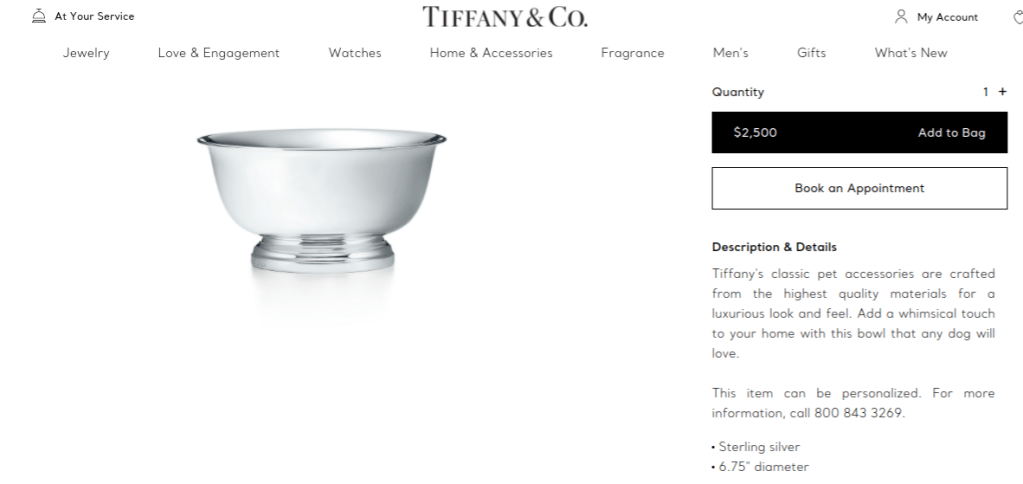 On an at-first-seemingly-unrelated note, I learned today that Tiffany & Co. sells a sterling silver dog dish for $2,500. Here’s a screenshot, in case you don’t wanna give their website any traffic: