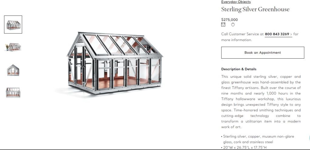 Anyway, that whimsical-ass silver dog dish isn’t even almost close to being the most expensive item listed on the Tiffany & Co. website. They offer a non-functioning decorative greenhouse for $275,000. That’s approximately two times more than I paid for my real house. Granted, my real house wasn’t “hand-assembled by the finest Tiffany artisans”, but I can stand inside my real house, so that’s gotta be worth something.