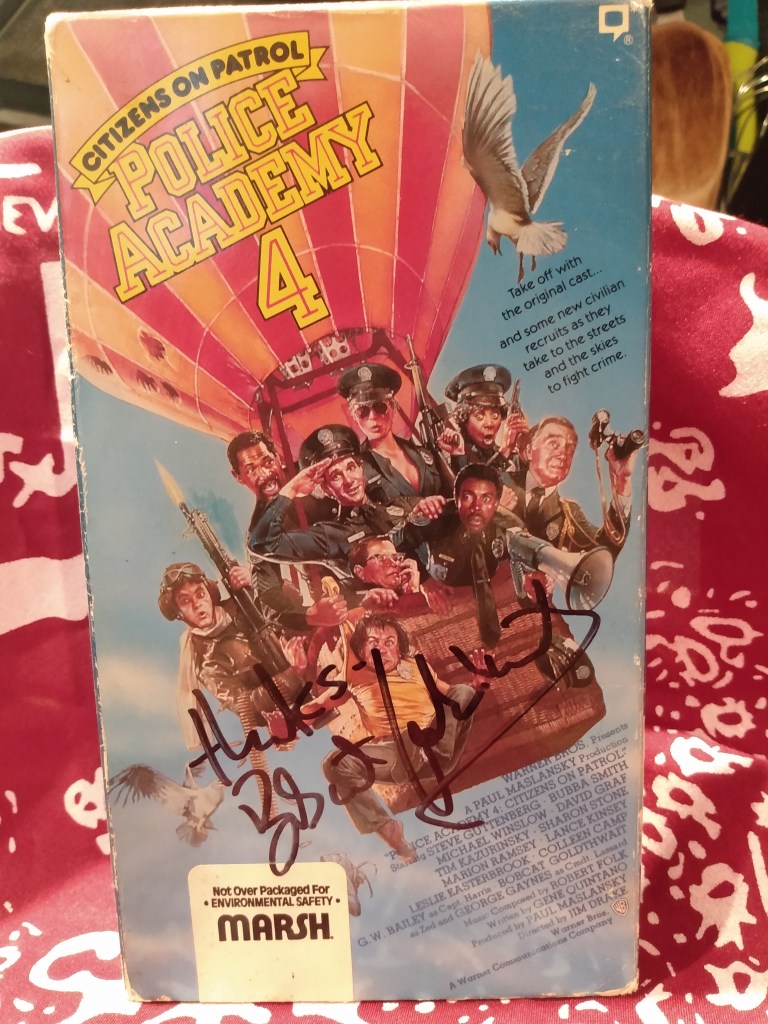 Fun tangent: I got the opportunity to meet Bobcat Goldthwait many years later/several years ago (god I’m getting old) and I told him a very abridged version of that story, and he listened patiently, and when I was all finished, he responded “Really? Police Academy 4 calmed you down? That’s pretty weird, man.” Then he signed the very same VHS copy of Police Academy 4: Citizens on Patrol that saved my life that night all those years ago. Bobcat Goldthwait is a hilarious, weird, very friendly man, and a true American Treasure.
