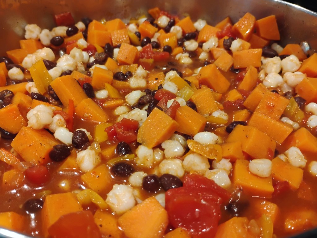 This is after stirring in black beans and hominy, but before it started simmering again.