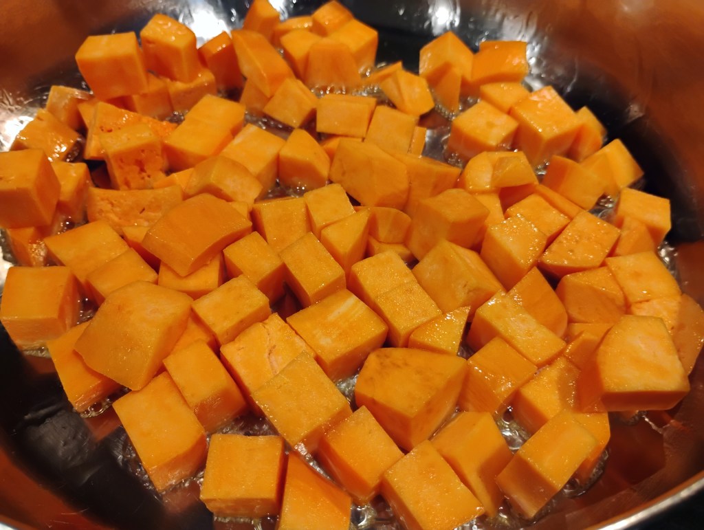 So what you do, see, is you add a tablespoon or so of olive oil to a medium-hot saute pan, then add the diced onions and cook for a couple of minutes, stirring often, until the onion starts to turn translucent, then add the peeled diced sweet potatoes. BEWARE OF SPLASHING OIL!