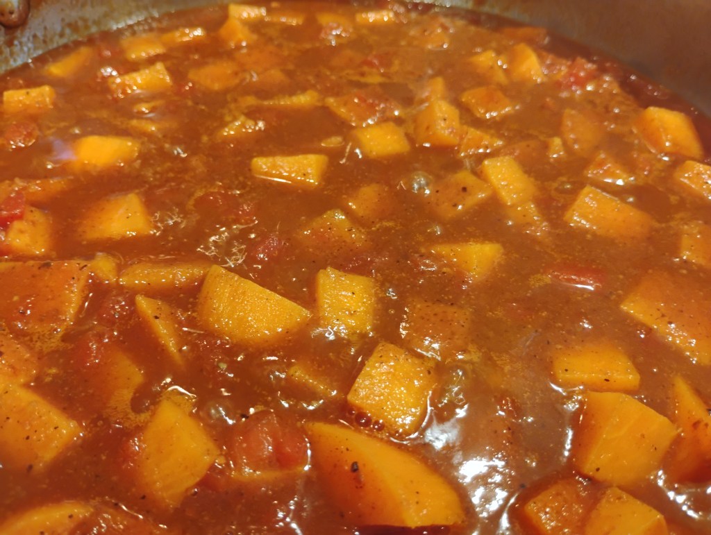 Bring it to a boil, then lower the heat back to medium and cook for like 5 minutes or so, stirring occasionally. The sweet potatoes should be softer, but still kinda firm, and the liquid should’ve reduced by approximately one-quarter to one-third of the beginning volume.