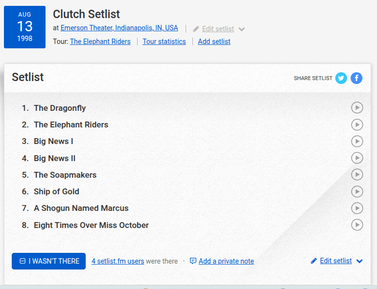 By the way, I acknowledge that it says “I WASN’T THERE” in that screenshot of the set list, but that’s not true. The screen read “I WAS THERE” before I logged in. The logic makes sense, but from a purely aesthetic point-of-view, as far as screen shots go, I don’t like it.