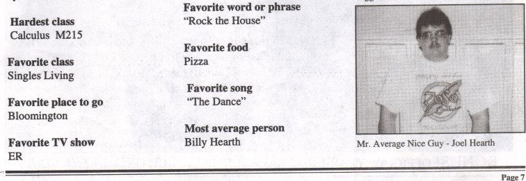 Not “Best Looking” or “Most Popular” or anything like that. What I won was “Most Average Person”, a category I don’t recall even noticing when I filled out my survey, though to be fair, I only voted for “Best Sense of Humor (Girl)” (my friend Liz) and “Best Sense of Humor (Boy)” (me). We arrived at my locker, and I stood sweating in my Jimmy Page & Robert Plant 1995 tour shirt while an ace photographer from the Star took my picture. A week or so later, I turned to the senior survey and located my picture way down in the bottom-right corner of page 7, way past the “Most Talkative” and total bullshit “Best Sense of Humor” categories, down below “Favorite Movie” (Forest (sic) Gump) and “Favorite Car” (Mustang), along with a caption: “‘Mr. Average Nice Guy’ – Joel Hearth”. How nice.