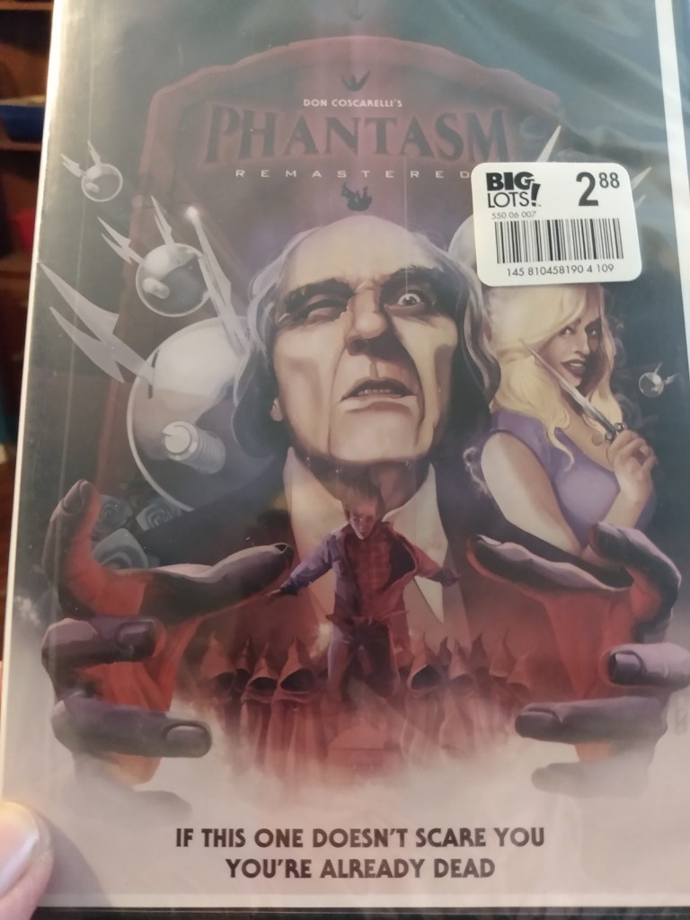 Last but not least, the icing on the cake that is My Day Off: I picked up a copy of Phantasm on DVD at Big Lots for fuckin two dollars and eighty-eight cents! I owned a DVD copy a long time ago, and it disappeared at some point. I own a VHS copy, but both of our VCRs shit the bed in the past year, and I haven’t gotten around to replacing either of them yet. Now I own a watchable copy, and I intend to watch it very soon. Maybe tonight, right after I finish this dumb thing.