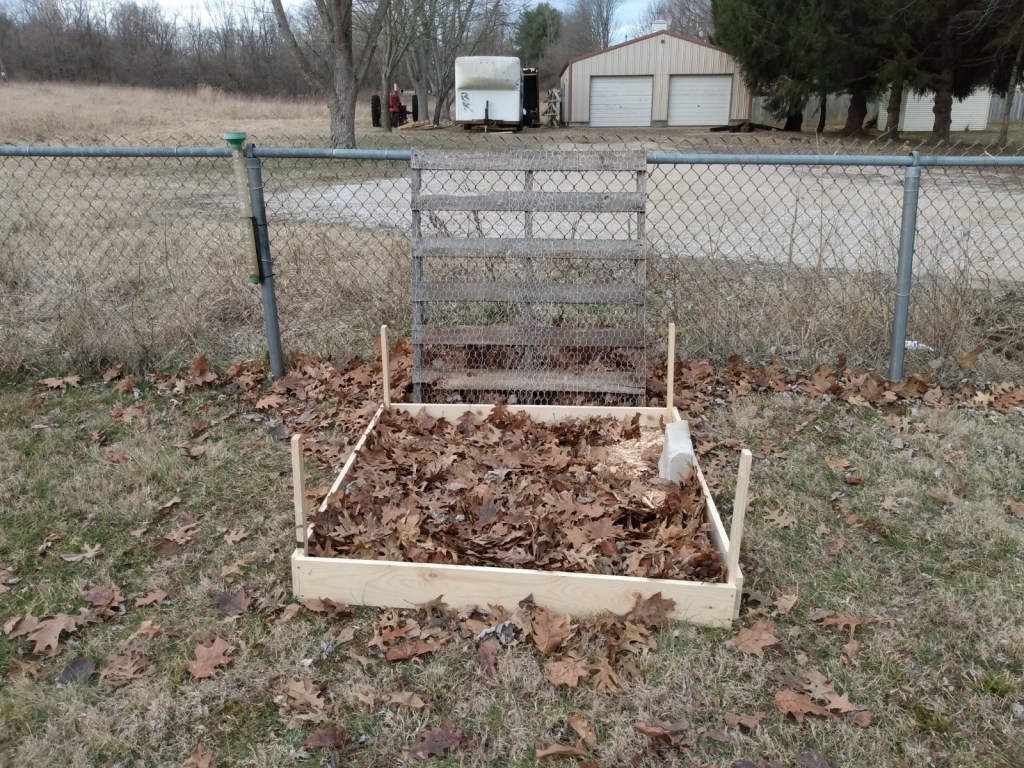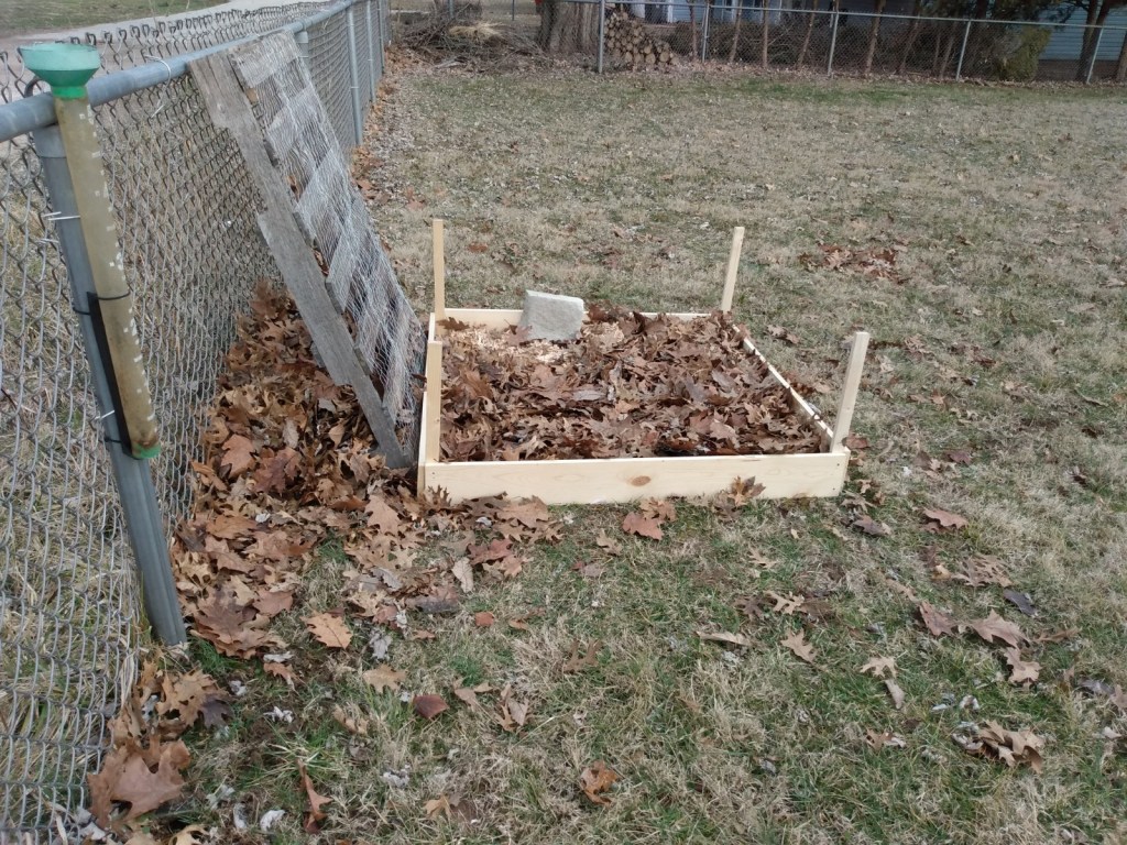 I lined the bottom with several layers of newspaper (thanks, IDS!) and some dead leaves. I’ll be adding my soil soonish, and I’ll figure out some kind of cheap way to protect the other three sides from deer, as well as other woodland critters.